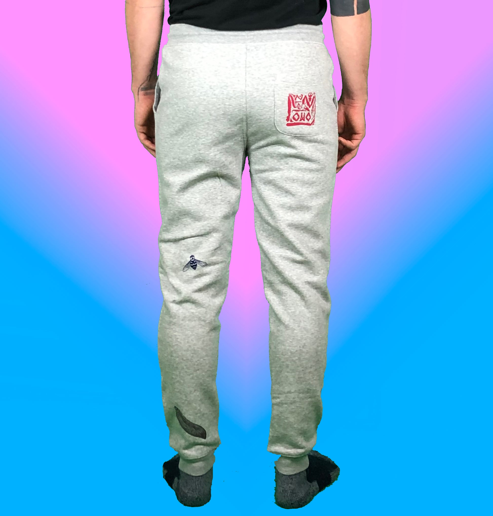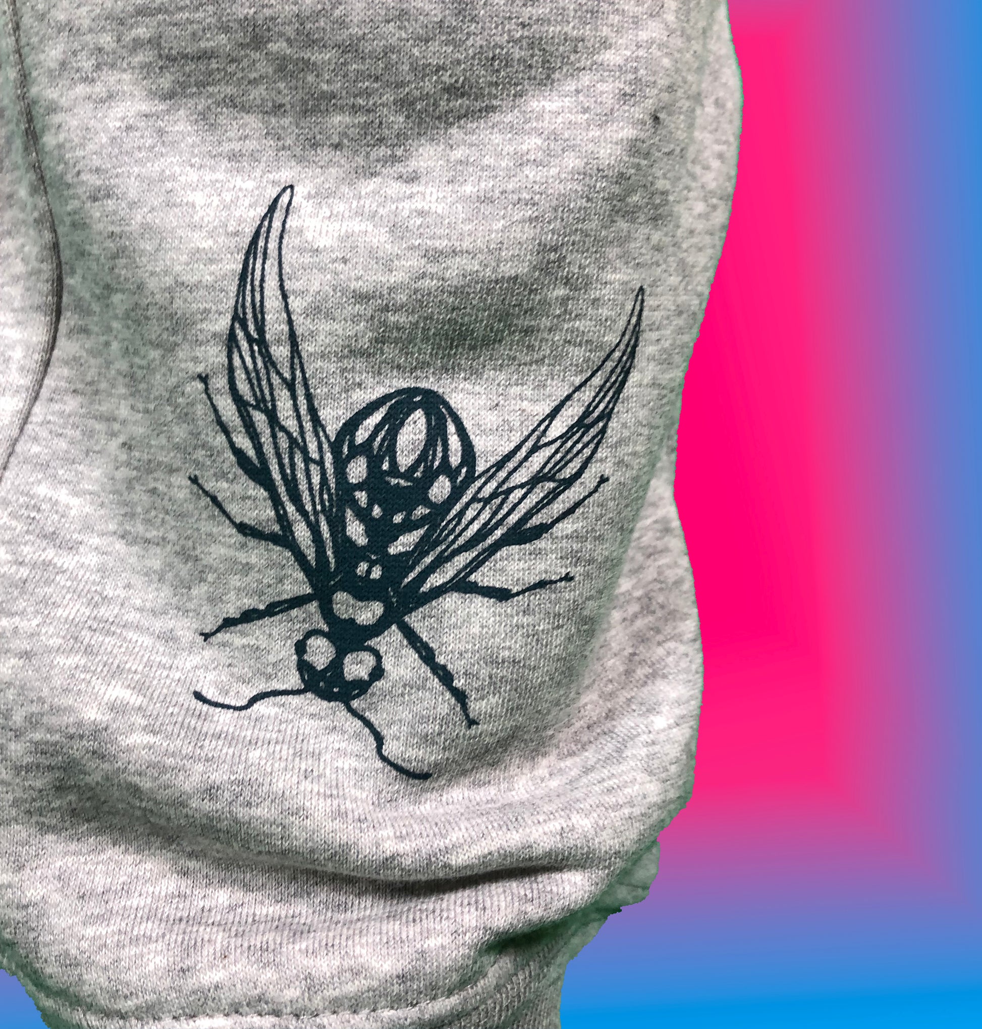 Jogging trousers (cotton, organic, fair, sustainable) with screenprints of insect drawings in different combinations. Let them crawl up your legs.