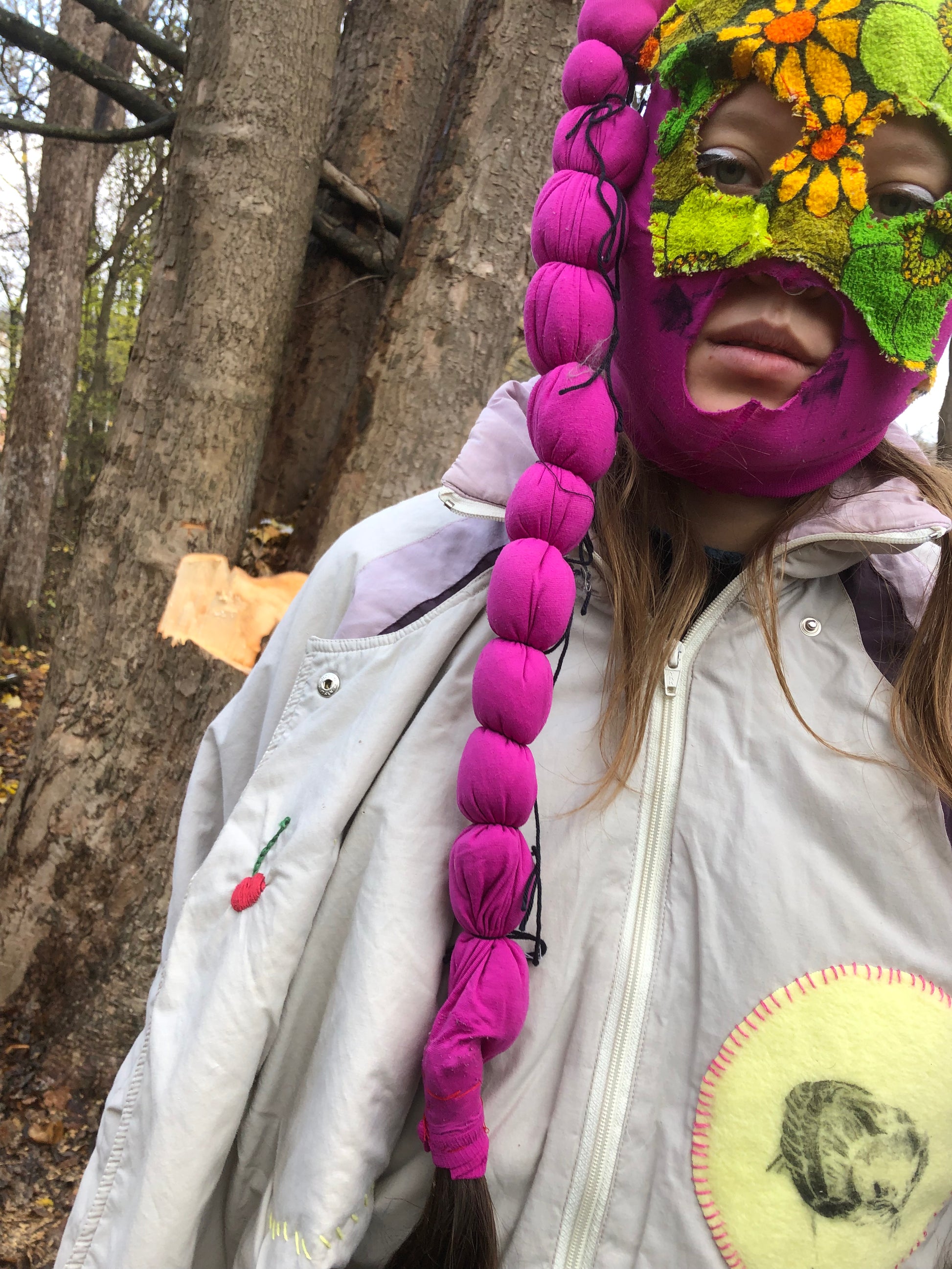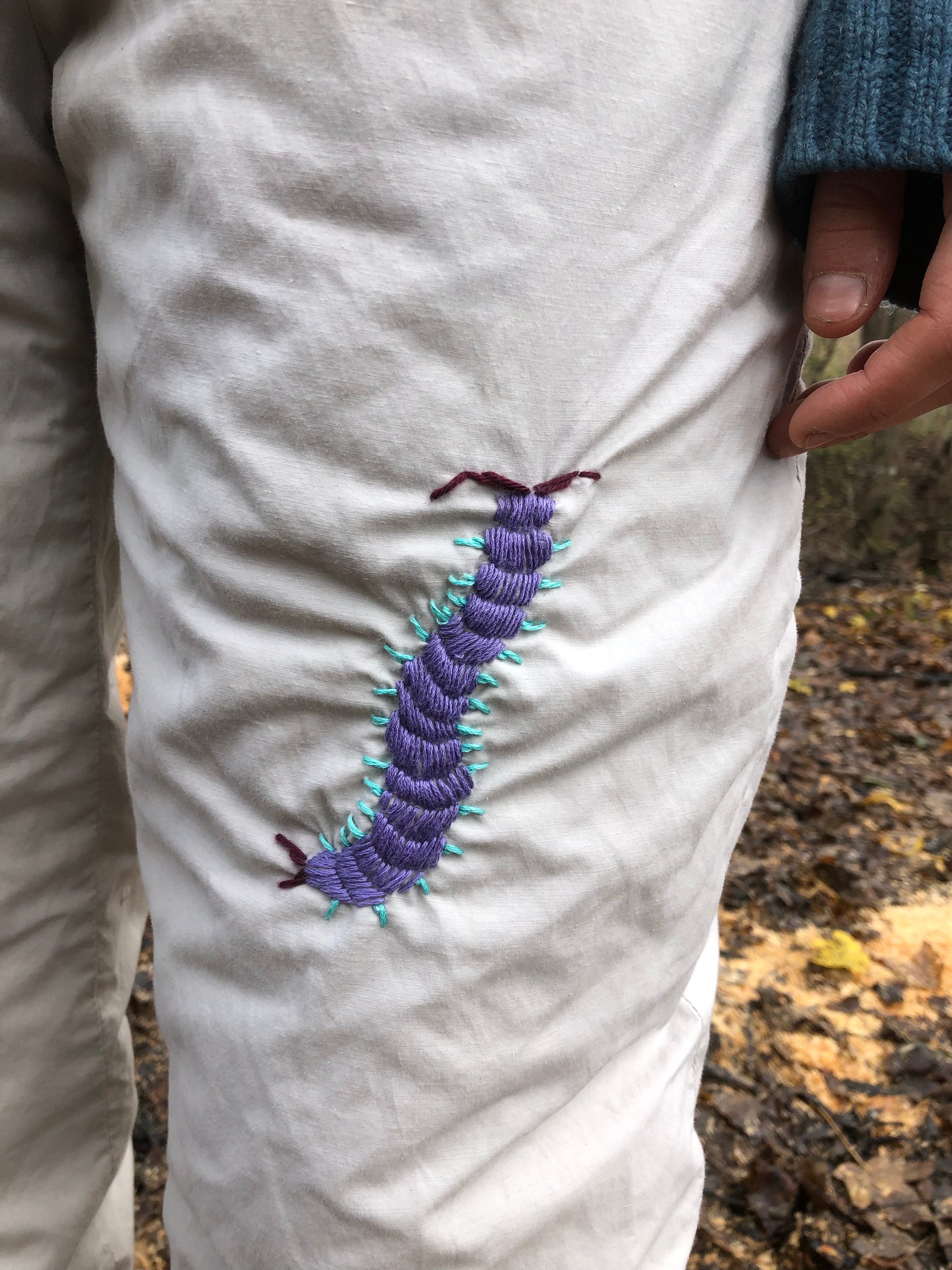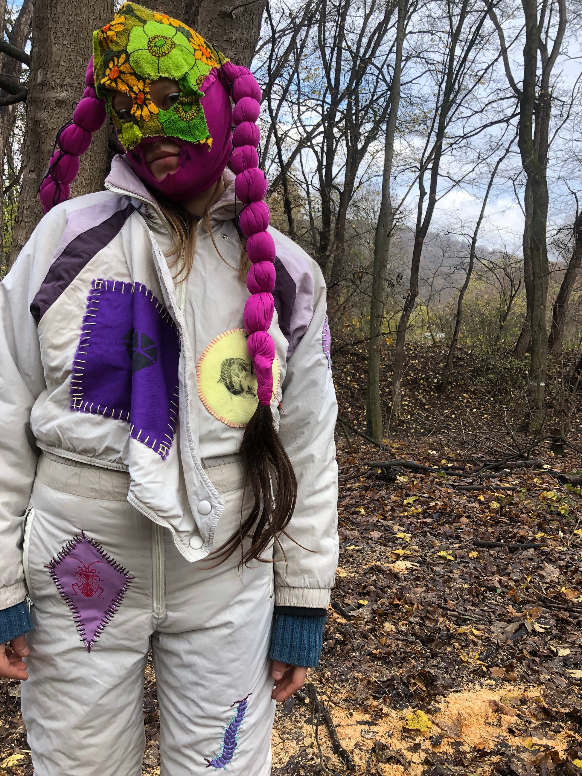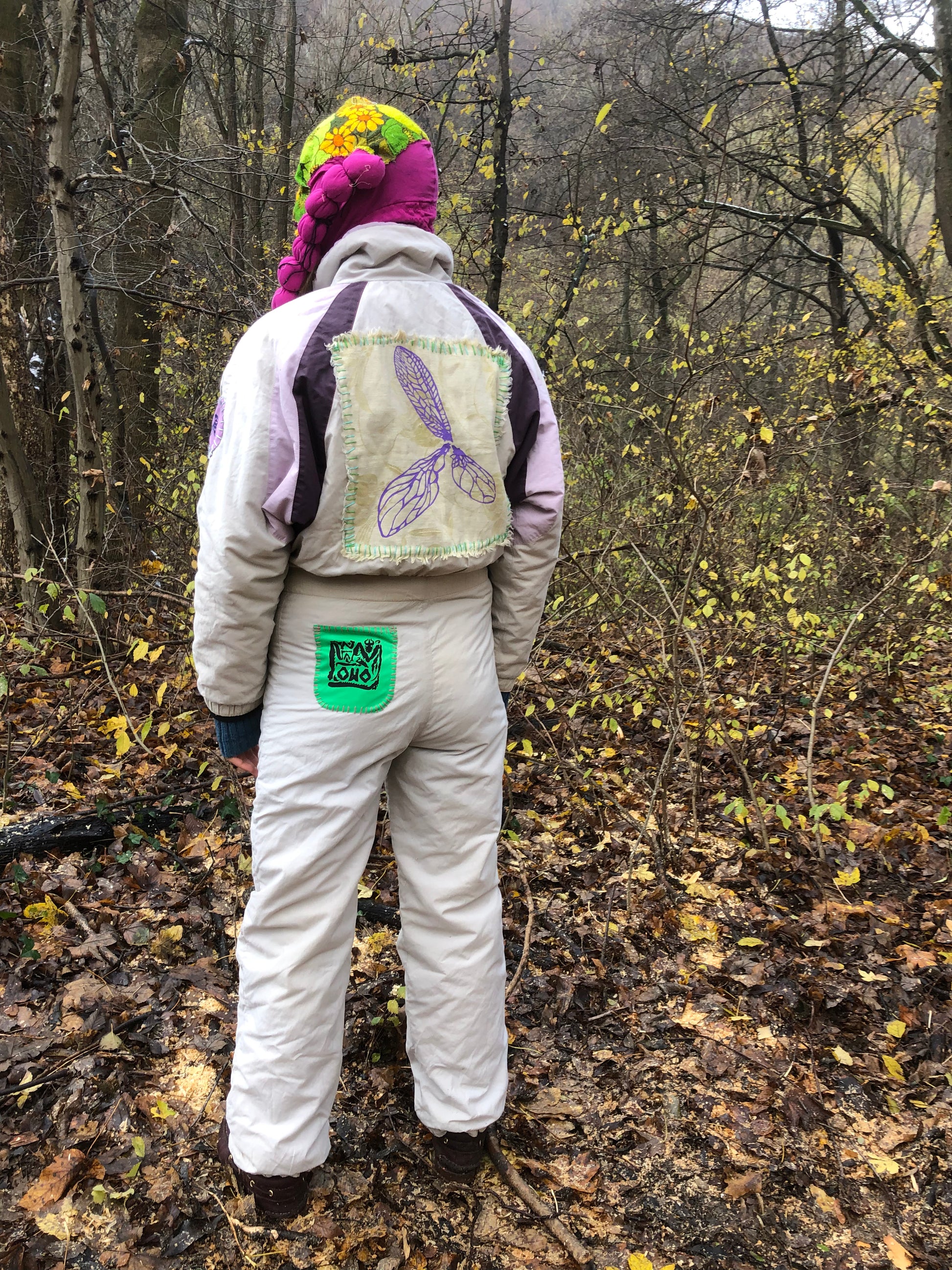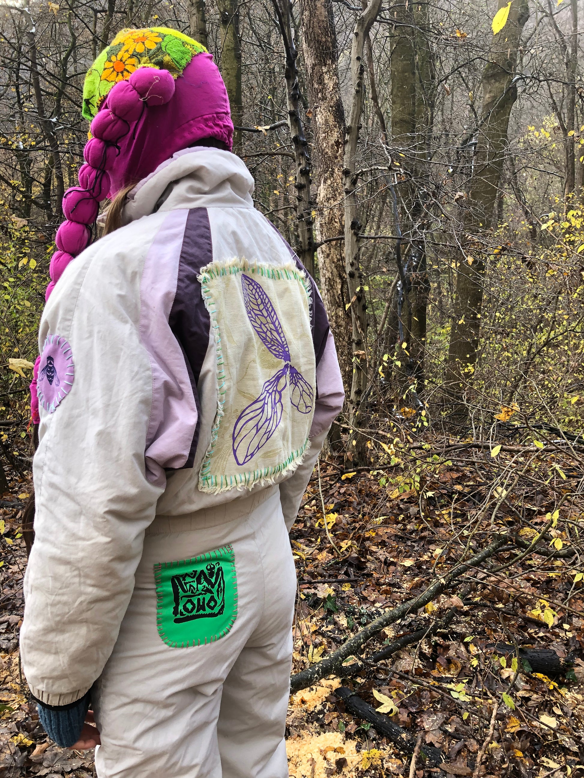 Vintage Skioverall (Size M) embellished with patches and embroidery depicting planet A creatures and beings.