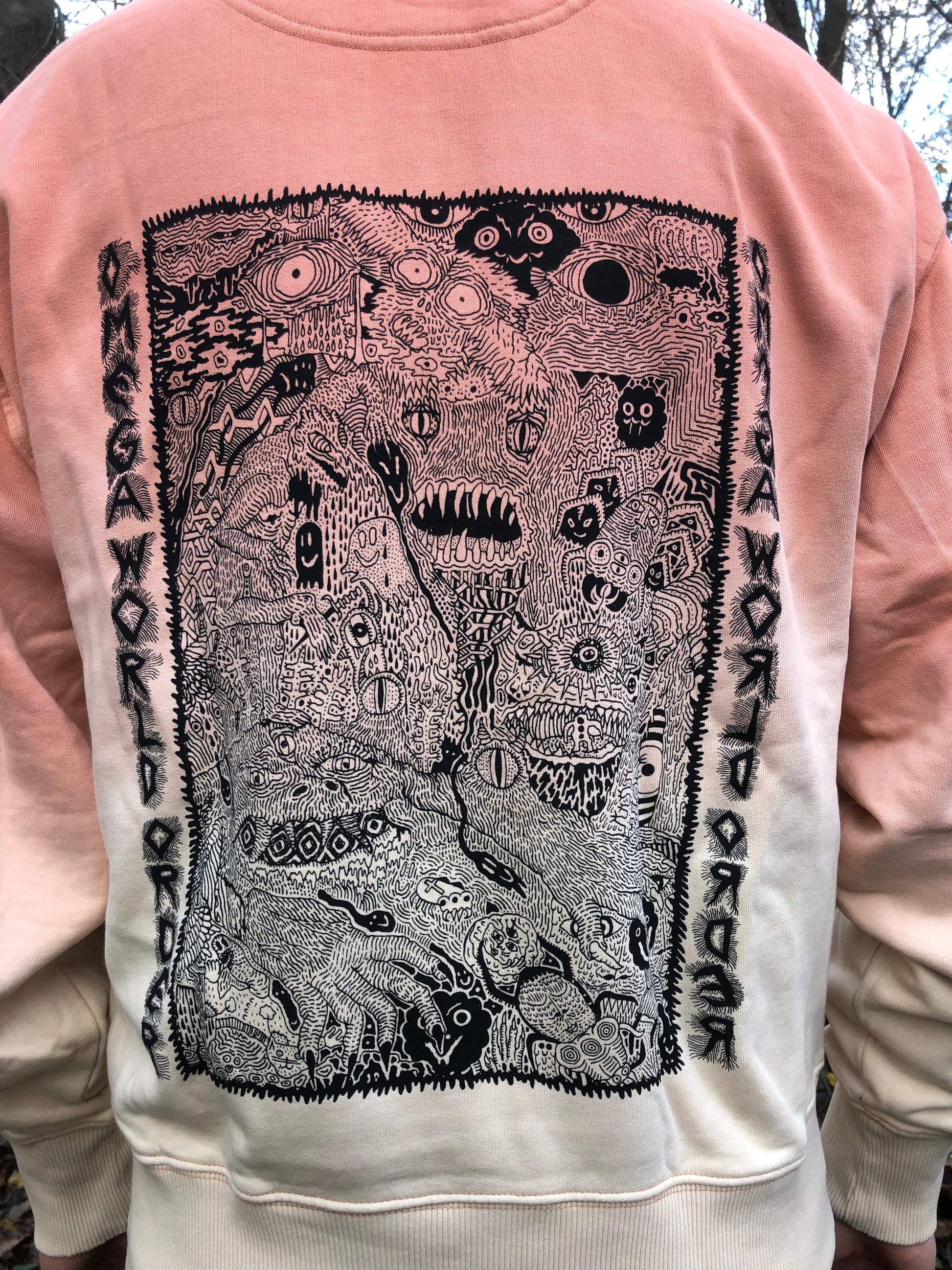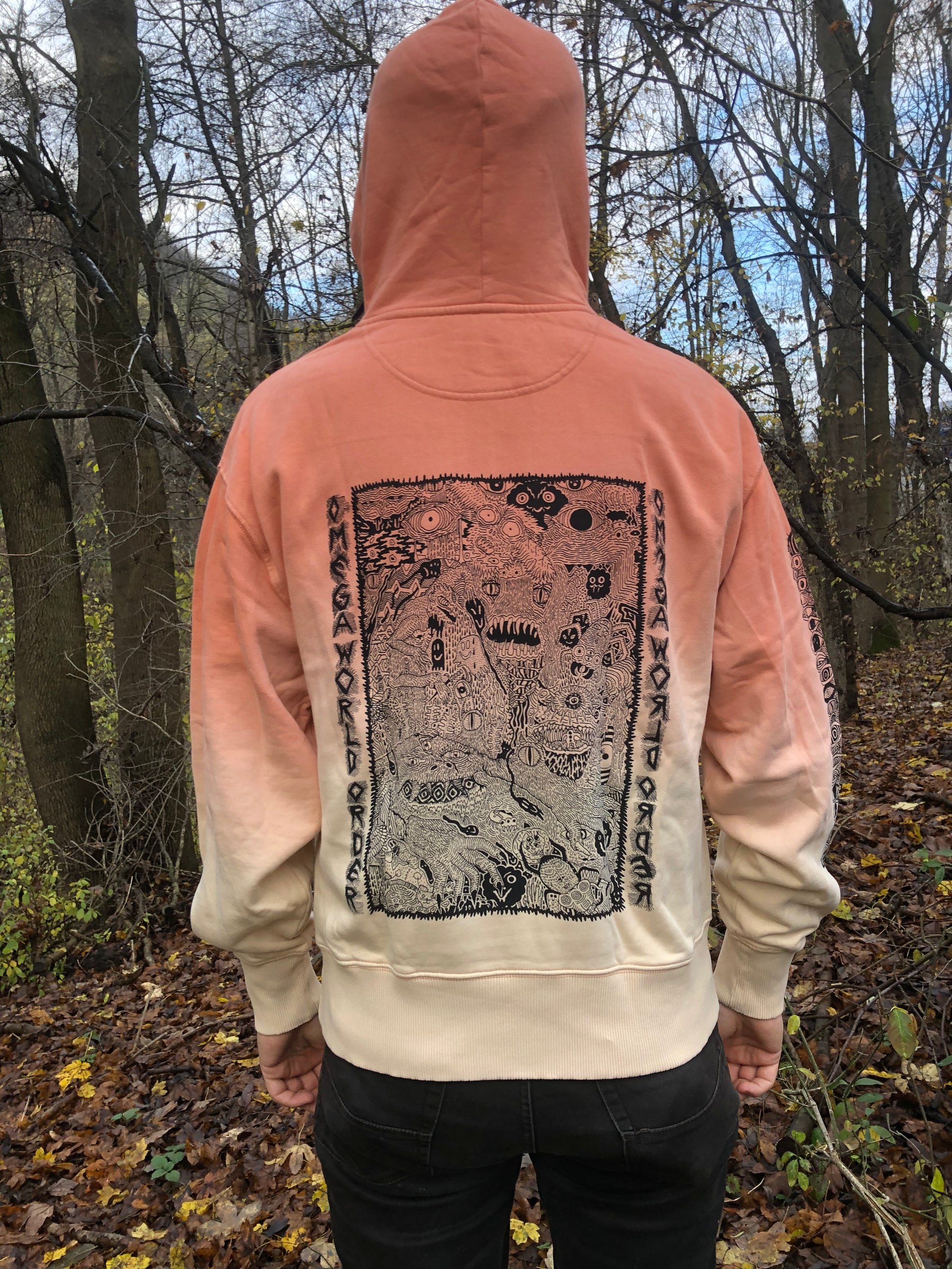 Cotton hoodie (organic, fair, sustainable) with screenprints on the back and right arm.