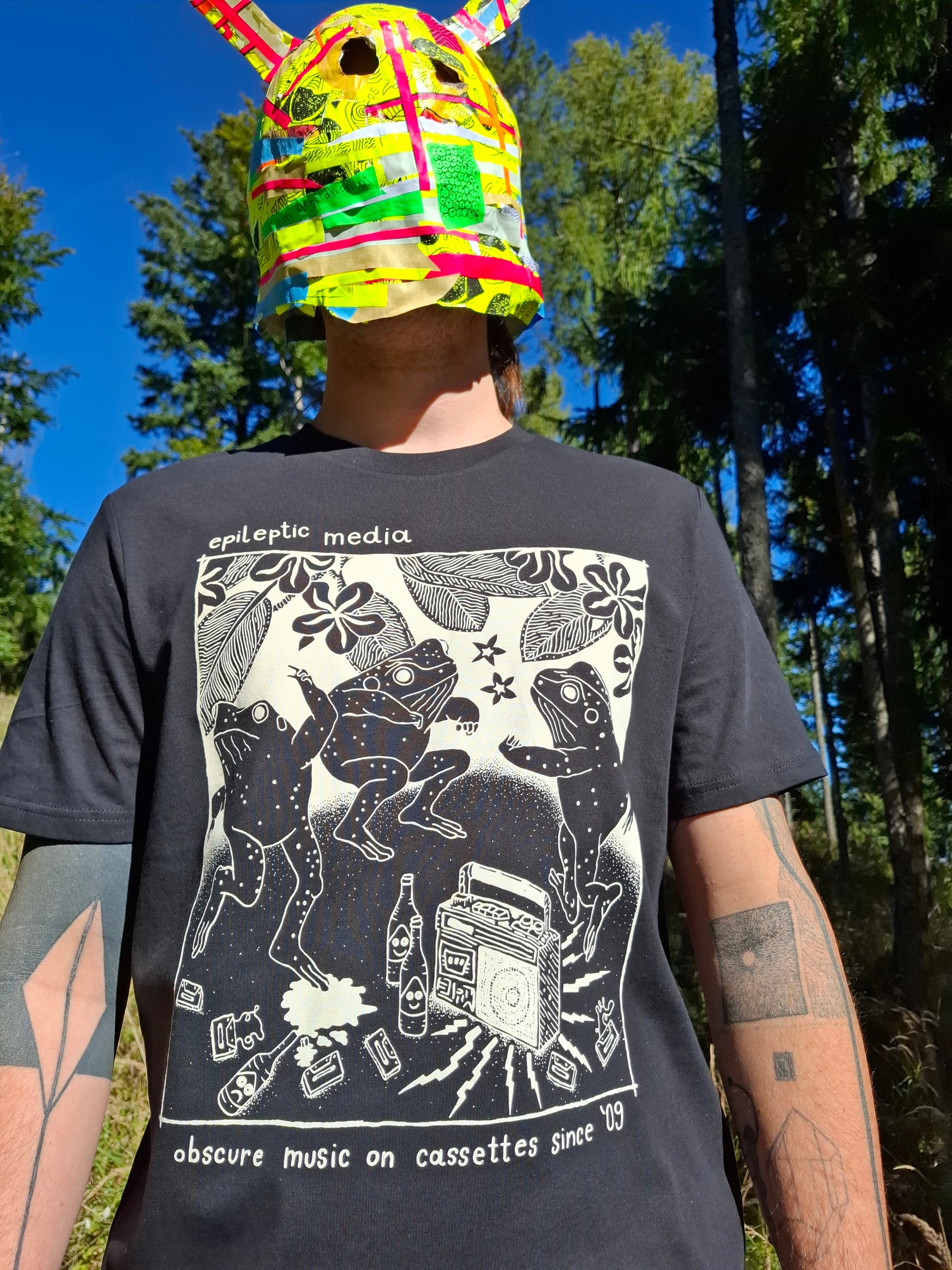 Front: frogs dancing to music. writing: epileptic media. obsucre music on cassettes since ´09.